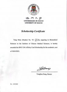 Congratulations! Tang Mian Wins BNU UM Affinity Card Scholarship